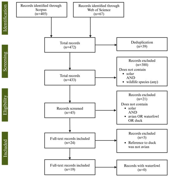 | Scopus | 26 August 2024 | Abstract, title, keywords | (“solar farm *” OR “solar park *” OR “photovoltaic power station *” OR “solar power plant *” OR “solar energy farm *” OR “solar array *” OR “solar garden *” OR “solar field *”) AND (waterfowl * OR bird *) | 58 |