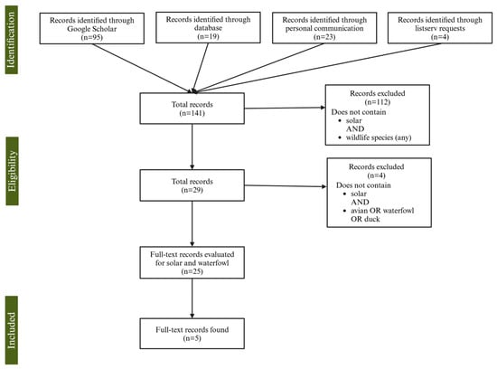 The final articles used for this paper from the full literature review incorporated a total of 141 sources, identified through a combination of Boolean database searches from the Web of Science and Scopus as previously described, listserv requests, personal communications, and Google Scholar queries. After filtering for studies that specifically addressed interactions between solar energy infrastructure and any wildlife species, 29 relevant records were retained. Narrowing the focus to interactions between solar energy and avian species reduced the dataset to 25 records. Of these, a detailed examination of references to waterfowl species resulted in the identification of five relevant sources from a global search (Figure 2).