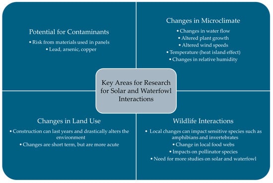 Through the literature review, we identified several key interactions with solar installations that have the potential to impact waterbirds and waterfowl. There is a lack of information on how solar influences factors such as environmental contaminants, microclimate, land use, and interactions between species and how these would play out in wetland environments. Here, we discuss how these interactions can influence wetland environments and the avian groups (waterbirds and waterfowl) that are dependent on wetland environments as part of their life histories.