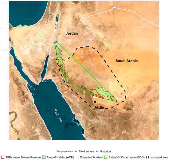 The Royal Commission for AlUla (RCU), established in 2017, aims to preserve and restore the cultural and natural heritage of the Arabian Desert. As part of this mission, the RCU has been conducting comprehensive biodiversity inventories and monitoring surveys, with a focus on rare and threatened species []. During these surveys, Nabatean thyme was recorded approximately 400 km south of its previously known locations in Jordan. This discovery makes it essential to reassess Nabatean thyme’s conservation status, considering the newly discovered populations. Accordingly, the objectives of this study were to document these new records and calculate species geographic parameters (i.e., species Extent of Occurrence (EOO; []), Area of Occupancy (AOO; []), Area Of Habitat (AOH; [])) and using this information to assign a conservation status of Nabatean thyme following the IUCN Red List criteria [].