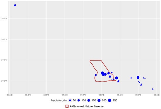 The distribution of the recorded individuals within these sites was highly scattered, with almost two-thirds of these sites containing only a small number of individuals (<20). The total number of mature individuals, estimated through enumeration, was approximately 1530. Of them, about 50% (ca. 760 individuals) were recorded inside the AlGharameel Nature Reserve, located northeast of AlUla County, which shows the crucial role of this reserve in conserving this species (Figure 3 and Table A1).