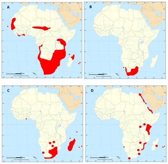 It was introduced to South Africa during the Angolo–Boer War (1899–1902) to enable efficient communication [117], and then became invasive. At present, it occurs all over southern Africa, reaching northern Angola in the west and northern Kenya in the east. It is, however, still absent in the DRC and in the East African Rift Valley [13,113]. In Namibia, it has reached high densities in towns such as Walvis Bay, Swakopmund and Katima Mulilo, but it is virtually absent in Hentjs Bay, Onguadiva and Tsumeb (Table 3). No geographical or ecological trends are apparent in this country.