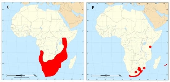 The original range of this species is the Middle East. In Africa, Passer domesticus indicus were introduced intentionally from India to Durban in the 1890s, and Passer domesticus domesticus from Great Britain to East London at the beginning of 20th century [49,50]. It had established a stable population in Gauteng only by the year 1950 [50]. By the 1980s, it had invaded most of southern Africa, including southern Democratic Republic of Congo (DRC) in the west and southern Tanzania in the east [50,51,52]. It is, however, still absent in the southern interior; for example, in 2013–2016, it was still absent in E Namibia and N Botswana (Table 3).