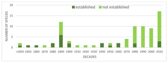 Over the last 200 years, two introduction peaks occurred in sub-Saharan Africa: the first at the end of the 19th century and the second at the end of the 20th and the beginning of the 21st century (Figure 2). The former resulted from the activity of the former British Acclimatization Society, which promoted introductions of alien species at the end of the 19th century in South Africa and other British colonies in Africa and beyond, for both utilitarian (hunting) and ‘aesthetic’ reasons (‘enrichment’ of local flora and fauna).
