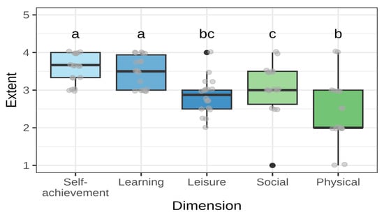 The results indicated a significant difference in participants’ motivations (p < 0.001, Kruskal–Wallis test). Self-achievement and learning emerged as the strongest motivations (Figure 2), followed by social motivation, leisure, and finally physical motivation as the lowest (Figure 2). The p-values for the pairwise comparisons between these dimensions, obtained from Dunn’s test, are presented in Table 5.