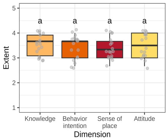 The quantitative analysis revealed no significant differences among the dimensions of learning outcomes (p = 0.81, Kruskal–Wallis test) (Figure 3). Although no single dimension stood out as the highest, the median values for all dimensions were above 3, indicating that most participants perceived positive learning outcomes across all dimensions through their involvement in this citizen science project (Figure 3).