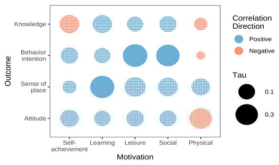 According to the results of Kendall’s rank correlation analysis, out of 20 correlations (5 dimensions of motivation × 4 dimensions of learning outcomes), only 3 showed significant positive associations: learning with sense of place (p = 0.06 < 0.1), leisure with behavioral intention (p < 0.05), and social motivation with behavioral intention (p = 0.08 < 0.1) (Figure 4).
