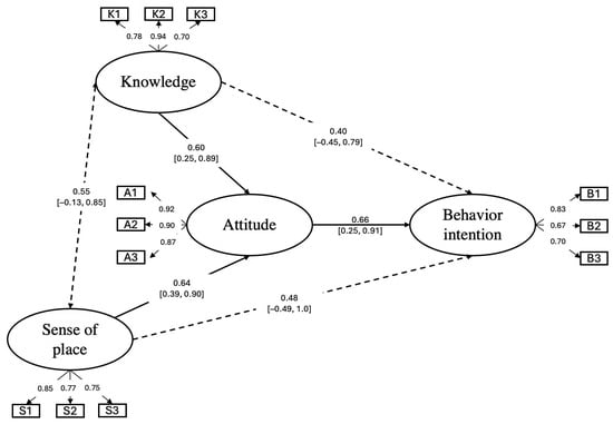 Partial Least Squares Structural Equation Modeling (PLS-SEM) was applied using the plspm package in R 4.4.3 [] to examine the relationships among latent variables related to learning outcomes and their influence on behavioral intention. Four latent variables were defined: Knowledge, Attitude, Sense of Place, and Behavioral Intention, with the corresponding items listed in Table 2. Due to the limited sample size, bootstrapping with 5000 resamples was conducted to evaluate the significance of the path coefficients, thereby enhancing the robustness of the model’s parameter estimates. The analysis was performed with a maximum of 5000 iterations and a convergence tolerance of 1 × 10−5.