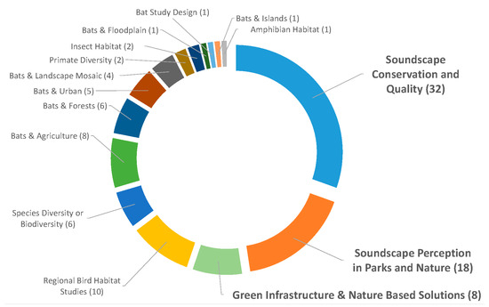 The remaining 104 relevant papers addressed aspects of the acoustic environment, soundscape, and conservation or GI. The 104 studies were further refined by title and keyword into the subcategories (Figure 1) of bats (n = 26), regional bird habitat studies (n = 10), primates (n = 2), insect and frog studies (n = 3), species diversity or biodiversity (n = 5), acoustic environment conservation and quality (n = 31), soundscape perception in parks and natural areas (n = 19), and green infrastructure and nature-based solutions (n = 8).