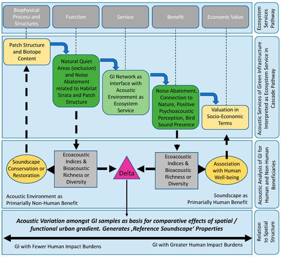 Figure 2 synthesizes ecosystem services in light of sound as a beneficial service for both human and non-human populations, linked via GI. The figure illustrates the ecosystem services pathway [47] and services cascade [39,48], with sound first integrated at the function step, referring to the provision of natural quiet or wild soundscapes or the abatement potential of GI extent. Spatially, these areas can be considered the nodes of resource provision in GI and are most likely related to habitat structure [29,31,49], serving as a relevant feedback for the assessment, planning, and management of open space and conservation areas. In the service step, the acoustic environment has a primarily human benefit interpreted as the soundscape [50] and is associated with the ecosystem services’ connection to nature, presence of bird sound, positive perception or well-being, and quietness. Here, the relevant soundscape typologies are everyday quiet areas associated with green and open space land uses, usually in the urban matrix, which are the focus of numerous studies found in our literature review [43,51,52,53,54,55,56,57]. The comparison of the soundscape between natural quiet areas and their urban counterparts is a pathway towards the generation of reference soundscapes where differences in acoustic community diversity, ecoacoustic indices, and SPL measures are relevant to establishing qualitative benchmarks. Finally, the position of GI amongst the urban matrix, ranging from GI with fewer to greater human impact burdens, is useful to explain acoustic outcomes.