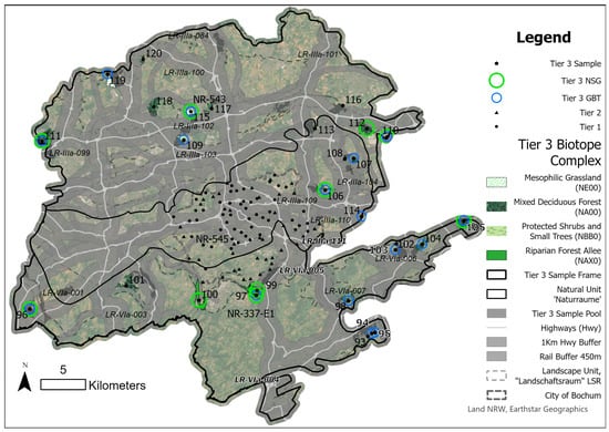 - The biotope complex, or “Lebensraumtypen” (LRT) defined as a functional unit at the landscape scale composed of many different biotopes (https://bk.naturschutzinformationen.nrw.de/bk/de/glossar/lrt, accessed on 2 February 2025). This unit forms the basis of tier 2 and 3 habitat samples. A range of spatial criteria are generated from these polygons beyond just area, including perimeter length, placement of sample on edge or core of LRT, and classification within the LANUV biotope network (§§20 &21 BNatSchG);