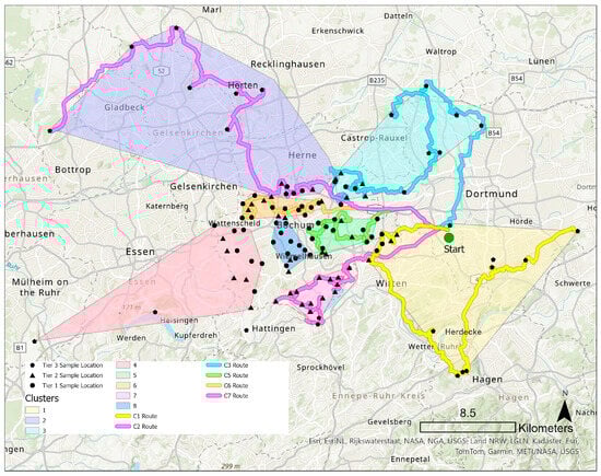 Following a habitat stratification procedure [27] and multi-tier conservation area approach [33], we use a three-tier stratified sample design to drive data collection. Tiers including GI in urban core areas (tier 1), GI areas in Bochum on the urban periphery listed in the protected biotope database (tier 2), and protected biotopes and nature protection areas in NR intersecting but adjacent to Bochum (tier 3). Sample selection for tier 1 locations is based on a stratified land use sample as applied in SALVE [65]. However, given the aim to sample “reference soundscapes”, tiers 2 and 3 sample procedures follow a multi-step process to locate a single sample point amongst a large sample frame and with a relatively small sample pool. This approach ensured selection of the largest and most remote locations and kept selection in-line with EU quiet area selection guidance [19,20].