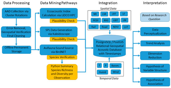 Our data analysis combines the multi-factorial approach described in SALVE [63] with the emerging soundscape analytics approach illustrated as a data processing, data mining, integration, and interpretation pipeline [71]. Our specific soundscape analytics approach includes collection of WAV data clusters as described above (processing), generation of ecoacoustic indices, sound source, and SPL measures from the WAV data (mining), integration of the mined acoustic data with five weather parameters and an array of landscape ecological data via sample location, and finally interpretation of the spatial-acoustic data while accounting for weather phenomena. We aim to organize the data using a PostgreSQL relational database to facilitate the large number of input tables and to generate the different data frames necessary for interpretation (Figure 7). The detailled development and application of the soundscape analysis pipeline is part of our ongoing research that will be summarized in a future publication.