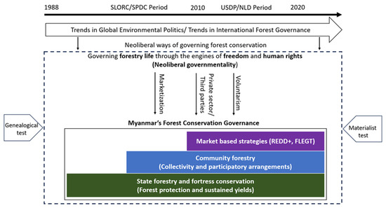 We have shown how neoliberal global environmental politics shaped Myanmar’s complex forest conservation landscape [19]. Using integrative methods from Foucauldian genealogy, governmentality, and neoliberal political philosophy, we examined the transformation of the arts of government. We performed a critical institutional study of transformative power in forestry. The neoliberal engine of the entrepreneurial agent exercises power through freedom to shape the politics of forest conservation [27]. Notably, Myanmarian scientific forestry appeals more to natural conditions, whereas the neoliberal and CBC models appeal more to the rights and freedom of individuals or groups. Furthermore, Myanmar’s “statification”—bringing public issues under state control—encompassed all forest conservation discourses but gradually shifted the state’s ground management responsibilities to the locals, third parties, and private sectors under the influence of “neoliberal governmentality” [18].