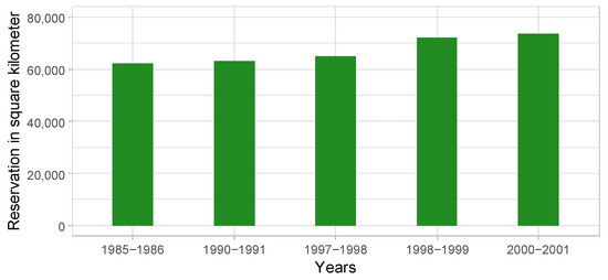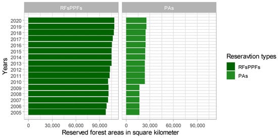 Myanmar also enacted the “Protection of Wildlife and Protected Areas Law” in 1994 to protect local wildlife, designating forest land as protected areas (PAs) for diverse species of flora and fauna (LR 5). Subsequently, the “Permanent Forest Estate” and “Sustainable Forest Management” terminologies were adopted from the International Tropical Timber Organization in the 1990s [16]. The Permanent Forest Estate was categorized into the following three subdivisions: (1) Reserved Forests (RFs), (2) Protected Public Forests (PPFs), and (3) PAs. In 2001, the National Forest Master Plan (NFMP) set total land area reservation targets for RFs and PPFs to 30% and PAs to 10% (LR 6). Following this century-old discursive strategy of protectionist ideas, the Myanmarian state forestry prioritized forest reservations and substantially increased reserved forest areas from 1985 to 2000 (622,962 km to 737,592 km) (Figure 2).