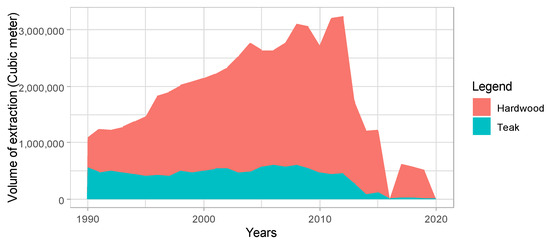 Myanmarian scientific forest management has a unique scientific logic around timber harvesting, where a forest section is divided into 30 blocks to be organized as a felling series over a 30-year felling cycle. The estimated yield is based on minimum girth limits for each block [36]. Thus, Annual Allowable Cut (AAC) is determined by three prime factors—area, girth, and time constraints (LR 7). Working cycle units with working plans were created to implement the Myanmar Selection System (MSS). The Forestry Department (FD) and Dry Zone Greening Department developed 70 district forest management plans, each representing a forest management unit (LR 7). All district forest management plans deal with extraction, conservation, and local engagement by subcategorizing the following seven working circles: (1) production, (2) watershed forest, (3) planted forests, (4) local supply, (5) non-wood products, (6) protected areas, and (7) special (LR 6).