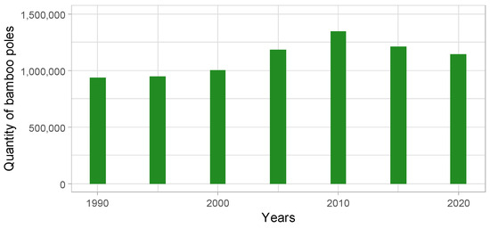 During the democratic transition period, the subsequent Union Solidarity and Development Party and NLD governments were aware of forestry issues and public desire. Meanwhile, the neoliberal discursive strategy of market liberalization, marketization, and the enhanced role of the private sector implemented during the military regimes (SLORC and SPDC) triggered forest depletion and degradation, resulting in a significant decline in the timber supply from natural forests, as reflected in the AAC—from over 300,000 trees in 1990 to 100,000 trees in 2018 (Forest Department, 2020). Subsequently, contemporary forestry research reports informed policymakers of the deteriorating conditions of Myanmar’s forests during the NLD regime [37]. Neoliberal market liberalization of the timber industry led to the severe overexploitation of forests—arguably the worst in Myanmar’s history—as state agencies failed to enforce timber extraction regulations on subcontracted private companies, pressured by neoliberal profit motives and authoritarian regimes (Figure 3) [16]. Not only did timber supply decline, but the booming neoliberal era also triggered a drop in one of the major non-timber forest products—bamboo extraction—after the 2010s (Figure 4). Influenced by deteriorating forest conditions, several workshops were conducted with top forestry officials and retired senior officials. The outcomes of these 2016 workshops under the NLD government were a one-year national logging ban and a ten-year ban in the Bago Mountain range, once known as the “home of teak” (News 1)—a full-scale 10-year reforestation effort—the Myanmar Reforestation and Rehabilitation Program (MRRP) was launched in 2017. The program was the biggest reforestation plan in Myanmar’s history. This initiative, grounded in the 1995 Forest Policy and the NFMP, aimed to develop a comprehensive forest plantation policy (LR 9). Therefore, the combined influence of protectionist knowledge and actual forest conditions catalyzed Myanmar’s most considerable reforestation effort—the MRRP.