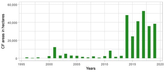 The FD reviewed CFI 1995, replacing it with CFI 2016 and, subsequently, CFI 2019. In CFI 2016, the FD added a section for community forest enterprises, rationalizing its importance for the sustainability of CFUGs. Moreover, economic activities in local forests were mandated under community forest-based enterprises. However, both enterprise terminologies were eventually consolidated into community forest-based enterprises in CFI 2019 (LR 11). Despite these changes, the FD continued to support traditional forest management principles under the guise of CFUG forestry management, raising questions about the effectiveness of the community-developed plans (RWP 6). The primary goal of neoliberal discursive strategy was to take the responsibility for the binary feature of ground management, where the FD took on the role of a regulator with diverse disciplines and procedures to ensure the state’s vision in the CF forests. Supported by the legitimacy of the NFMP and Forest Policy 1995, this hybridized CF program expanded from 785.49 hectares in 1996 to 289,161.65 hectares in 2019 (Figure 7) (LR 7). Myanmarian CF program shifted toward a neoliberal strategy that advocates market techniques and human rights by reducing and hollowing out the state’s responsibilities in forest management, timber marketing, and trading. However, the individual or collective responsibilities of the CF program with enhanced market rights also exposed the risk of illegal logging promoted by market motives and liberal creed in forestry [16,38]. The weak enforcement of regulations extends beyond illegal logging to land appropriation, where urban individuals exploit loopholes by registering as members of local Community Forestry User Groups (CFUGs). In doing so, they confiscate CF land, hold it, and resell it to wealthy urban investors—particularly in popular tourist areas such as Mandalay, Naypyidaw, and Pyin Oo Lwin.