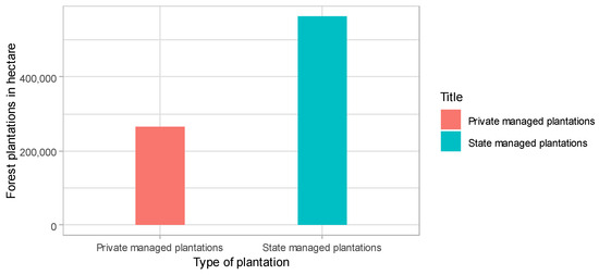 With the shift toward economic liberalization, the FD began permitting the establishment of private plantations. The aims were to accelerate plantation forestry, meet timber demand, increase forest cover, and enhance job opportunities. Private investors are granted 30-year leases. The new Forest Law (2018) further confirmed and legitimized the role of private actors in the forest plantation industry. The following figure illustrates the rapid development of private forest plantations in Myanmar. State-owned plantations were established solely by the FD. Between 1981 and 2019, the FD established over 0.5 million hectares of forest plantations. In contrast, although the private sector was a latecomer, it reached over 0.26 million hectares within 13 years (Figure 8).