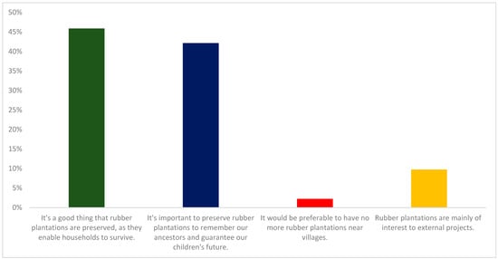 Figure 3 below shows the distribution of respondents according to their perception of the conservation of historical rubber plantations. The results show that 45.89% of respondents affirmed that it is good that rubber plantations are preserved, as they enable households to benefit from them in the event of a revitalization of its value chain, which would still remain foreseeable, 42.14% of respondents said that it is important to preserve rubber plantations to remember ancestors and guarantee children’s future, 9.73% of respondents said that it would be preferable if there were no more rubber plantations near villages, and 2.24% of respondents said that rubber plantations are mainly of interest to external projects.