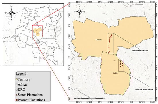 Location of the study area in Sankuru Province, Democratic Republic of Congo. The map shows the two target areas: Lomela, where the state plantations are located (symbolized by red triangles), and Lodja, where the peasant plantations are located (symbolized by red squares). The inset on the left shows the location of Sankuru Province within the national and continental context.