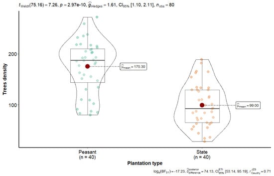 Welch’s t-test was implemented through the R Commander and vegan package usage in similar ecological studies [30,40,41] to assess the equality of mean densities (individuals, species, and families) and mean basal area of the two plantation types. The rationale behind employing this parametric test stemmed from the findings of the Shapiro–Wilk normality test and the Fisher test, which attested to the normality and equality of variances across the diverse sets of data collected.