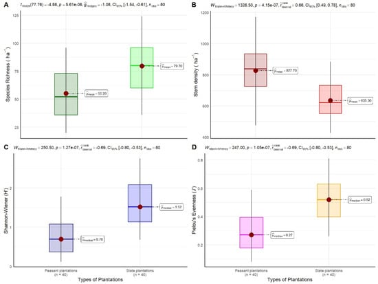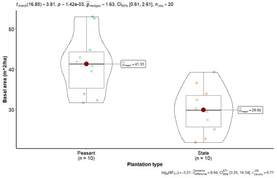 The mean basal area of state plantations was 29.88 ± 5.8 m2 ha−1, compared to 41.37 ± 7.57 m2 ha−1 observed in peasant plantations (see Figure 3). This discrepancy can be attributed to a high density of small-diameter trees, resulting in a low sum of tree cross-sections measured at 1.30 m from the ground. State and farmer plantations of Hevea brasiliensis are characterized by a predominance of small-diameter trees, with few large-diameter trees, resulting in a high density of small-diameter trees per hectare. Welch’s t-test revealed a significant difference for density (t = 4.61; p = 3.45 × 10−4), species richness (t = 4.61; p = 3.45 × 10−4), family richness (t = 3.30; p = 5.56 × 10−3), and basal area (t = −3.81; p = 1.42 × 10−3).