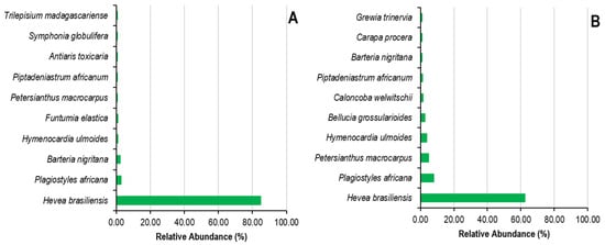 Relative abundance of plant species in state (A) and peasant (B) rubber plantations in Sankuru province.