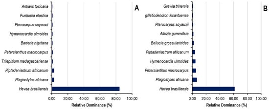 Relative dominance of species in state (A) and peasant (B) rubber plantations in Sankuru province.