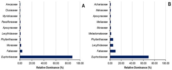Relative abundance of botanical families in state (A) and peasant (B) rubber plantations in Sankuru province.
