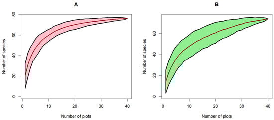 The species rarefaction is a graphical representation of the increase in species found in a biotope as a function of the number of samples taken. The individuals-species curve, on the other hand, signifies the number of individuals per species surveyed. The species rarefaction and individual-species curves were calculated using the specaccum function in the vegan package of R software [30], using the random method. The red line in the center represents the area-species curve, and the colored area (green or pink) represents the confidence interval. The confidence interval was calculated at a 95% confidence level, representing the margin of error considered in this analysis to assess the robustness and sufficiency of the sampling effort.