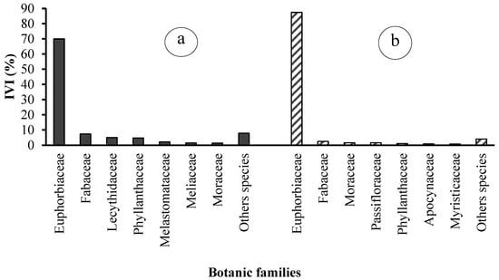 The relative dominance of families of the top ten species and top seven botanical families in Sankuru rubber plantations is demonstrated in Figure 7. Regarding the relative dominance of the families listed in state plantations, the first seven families demonstrate 93% relative dominance, compared with 17% for the remaining 22 families. Of these seven families, Euphorbiaceae (69.05%), Fabaceae (9.56%), Lecythidaceae (5.34%), Phyllanthaceae (5.17%), Melastomataceae (1.82%), Moraceae (1.19%), and Meliaceae (1.05%) are shown in Figure 6. In peasant plantations, the first seven families exhibit a relative dominance of 96%, while the remaining 25 demonstrate a relative dominance of 14%. A closer look at the seven families reveals the following: Euphorbiaceae (87.12%), Fabaceae (3.69%), Moraceae (1.92%), Passifloraceae (0.80%), Phyllanthaceae (0.95%), Apocynaceae (0.89%), and Myristicaceae (0.56%).
