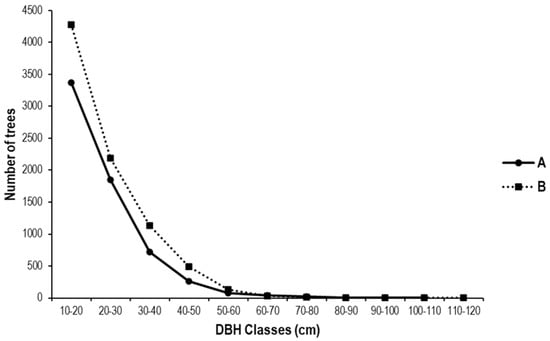 The horizontal structure of a stand refers to the distribution of tree diameters, while the vertical structure refers to the distribution of heights, i.e., the stratification of the stand [44,45]. These two structures are essential for understanding the complexity, biodiversity, and resilience of forest ecosystems. About horizontal structure, tree populations were classified into 10 diameter classes (0–10 cm; 10–20 cm; 20–30 cm; 30–40 cm; 40–50 cm; 50–60 cm; 60–70 cm; 70–80 cm; 80–90 cm and 90–100 cm) to characterize the two plantation types and compare them in stand structure. The diameter classes were established using diameter at breast height (dbh) data as a reference. Diameter-class analysis reveals age structure, regeneration status, and potential management needs in Sankuru’s rubber plantations.