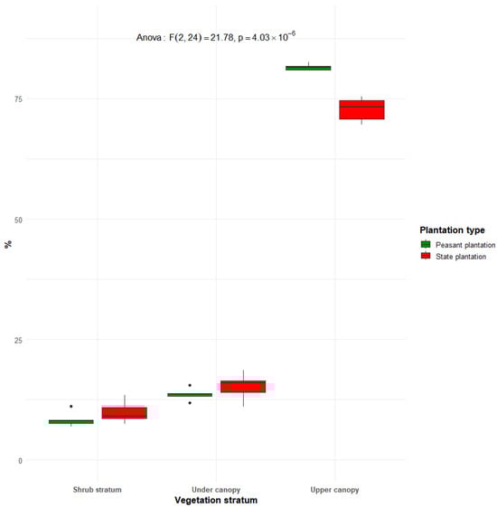 In this study, H′ is defined as the Shannon diversity index, n is the total number of species recorded in the ecosystem in question, and Pi is the individual proportion of species i. The Shannon index is a widely used metric for assessing species richness and evenness in an ecosystem [50]. In the context of our study, this index is particularly relevant for quantifying the diversity of plant species present in historical rubber plantations. Higher values of the index indicate greater specific diversity. This index enabled a comparative analysis of plant diversity between state-owned and peasant plantations, providing crucial information for understanding the impact of plantation management and structure on local biodiversity [50]. The Shannon diversity index (H′) generally varies between 1 and 5 bits in comparable forest ecosystems, although it has no fixed upper limit, as its value depends directly on the number of species present and the distribution of their abundance [51]. In addition, diversity indices were calculated for each sampling unit, corresponding to a 0.25 ha inventory plot within each plantation type, in order to enable a meaningful comparison between the different floristic and ecological structures at the local level [26].