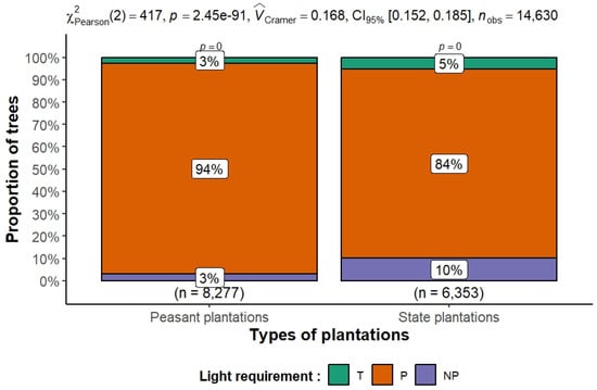 Furthermore, a range of statistical tests were utilized to identify significant differences between plantation types. For instance, Pearson’s χ2 test was applied to examine the association between plantation categories (state-owned versus peasant) and the distribution of species based on their ecological requirements (pioneer, non-pioneer, shade-tolerant). Cramer’s V was used to measure the strength of this association, especially for qualitative variables such as ecological temperaments. Fisher’s exact test was employed to compare the proportions of endemic species between plantations. Finally, for continuous variables that failed to meet the assumption of normality, such as species richness or tree density, the non-parametric Mann–Whitney U test was used to compare distributions between the two management systems. Finally, Welch’s t-test, a variant of the classic t-test, was used to compare the initial density, number of trees, number of species, number of genera, number of families and basal are averages between the two types of plantations without assuming equality of variances between the groups. All analyses were conducted using R software version 4.4.1 [30], with a significance threshold set at p < 0.05.