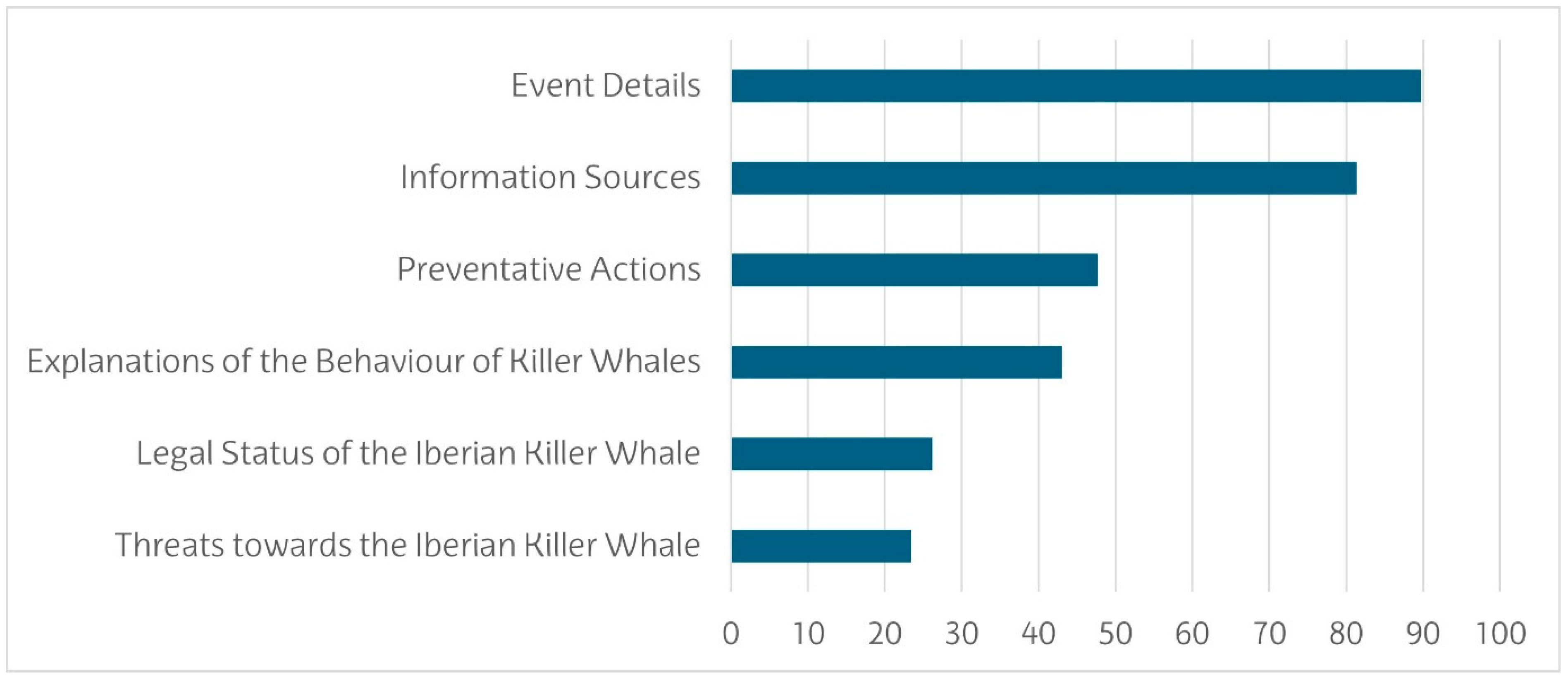 First, the information regarding the details of the incidents caused by Iberian killer whales was presented in 9 out of ten news items, thus accounting for most of the sample. The articles usually addressed several relevant aspects of these events; thus, 70% of the articles mentioned more than one of the six informative categories associated with this variable. In this context, the type of vessel involved, the geographical location of the event, and the damage caused by the attack were notable.