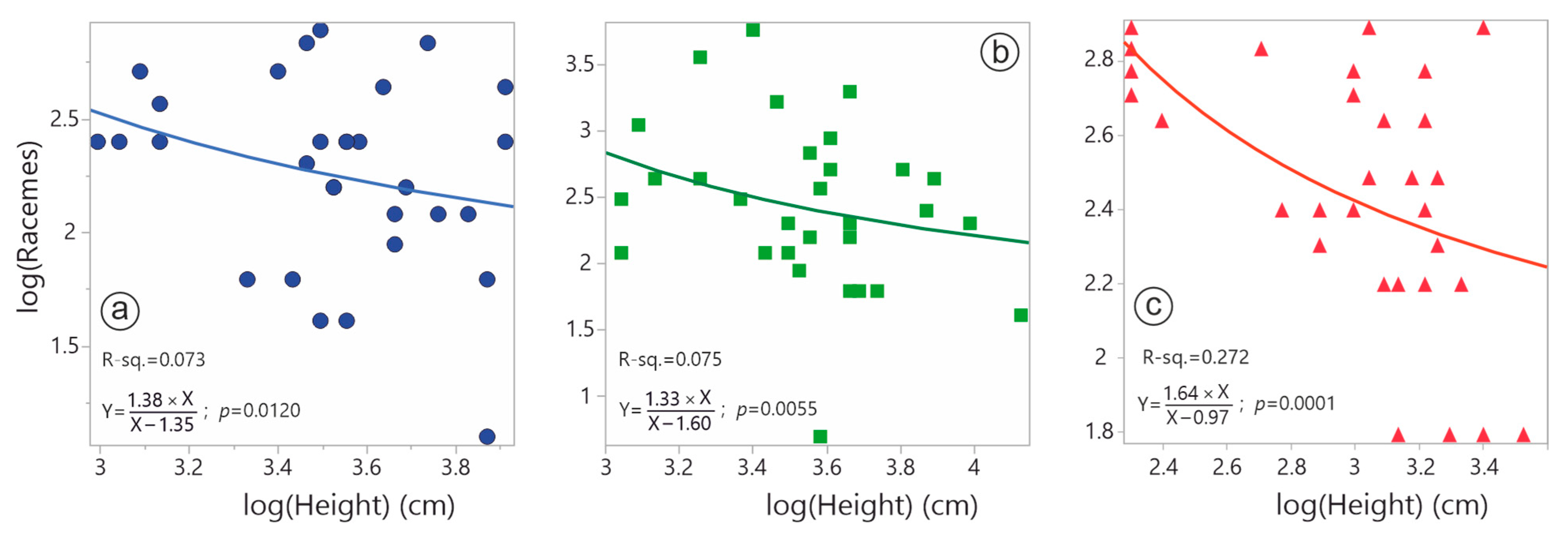 - Weiner, J.; Campbell, L.G.; Pino, J.; Echarte, L. The allometry of reproduction within plant populations. J. Ecol. 2009, 97, 1220–1233. [Google Scholar] [CrossRef]