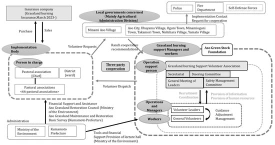 First, interviews were conducted in order to understand the organizational structures, roles, and relationships of each entity involved in controlled burn operations. A questionnaire survey was conducted to clarify the factors that led to the introduction of volunteers in pastoral associations. Aso GS, volunteer leaders for controlled burn support (hereafter referred to as “volunteer leaders”), and local government bodies, Aso City and Minami Aso Village were selected as organizations involved in grassland conservation and management as subjects for the interview survey. Aso City was selected for the survey because it covers the largest area in the Aso region and has the largest number of pastoral associations, while Minami Aso Village was selected because of its uniqueness: the village mayor is responsible for any accidents that may occur during controlled burn operations. Table 1 presents the interview targets and the roles of each stakeholder in the implementation of controlled burning. Structured interviews with each entity were conducted with volunteer leaders on 6 March 2023 and 29 August 2023 and with Aso GS on 29 August 2023. Since the situation and roles of each entity involved in grassland maintenance and management are different, we interviewed them about the outline of their organizations, their objectives, the number of people involved, the historical evolution of their activities, key points of consideration when conducting activities, especially in terms of the organization of safety management, and cooperation with and positioning of other organizations. On 29 August 2023, we visited the Aso Kujyu National Park Management Office and interviewed the local pastoral cooperative. On 29 August 2023, we visited the Aso Kujyu National Park Management Office to confirm the status of policies of Aso Kujyu National Park and to schedule a questionnaire survey in advance. On 29 August 2023, we conducted a pilot implementation and confirmed the questionnaire forms with the staff of the Aso Kujyu National Park Management Office, the secretariat of the Aso Greenstock Foundation, and the volunteer leaders for grassland burning.