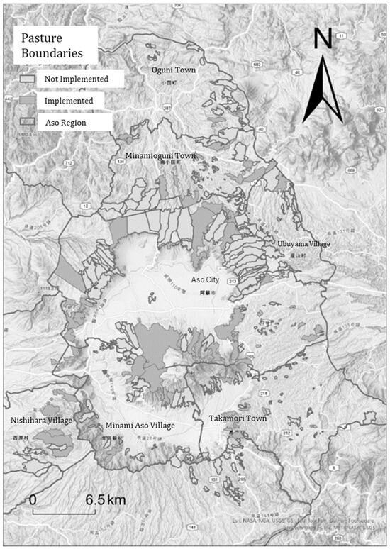 Volunteer-Introduced and Non-Introduced Areas in Pastoral Associations of the Aso Region. Source: Aso Grassland Restoration Council, “Pasture Boundary Data” [31]. Note: Prepared by the author using the data and ArcGIS Pro 2.9.