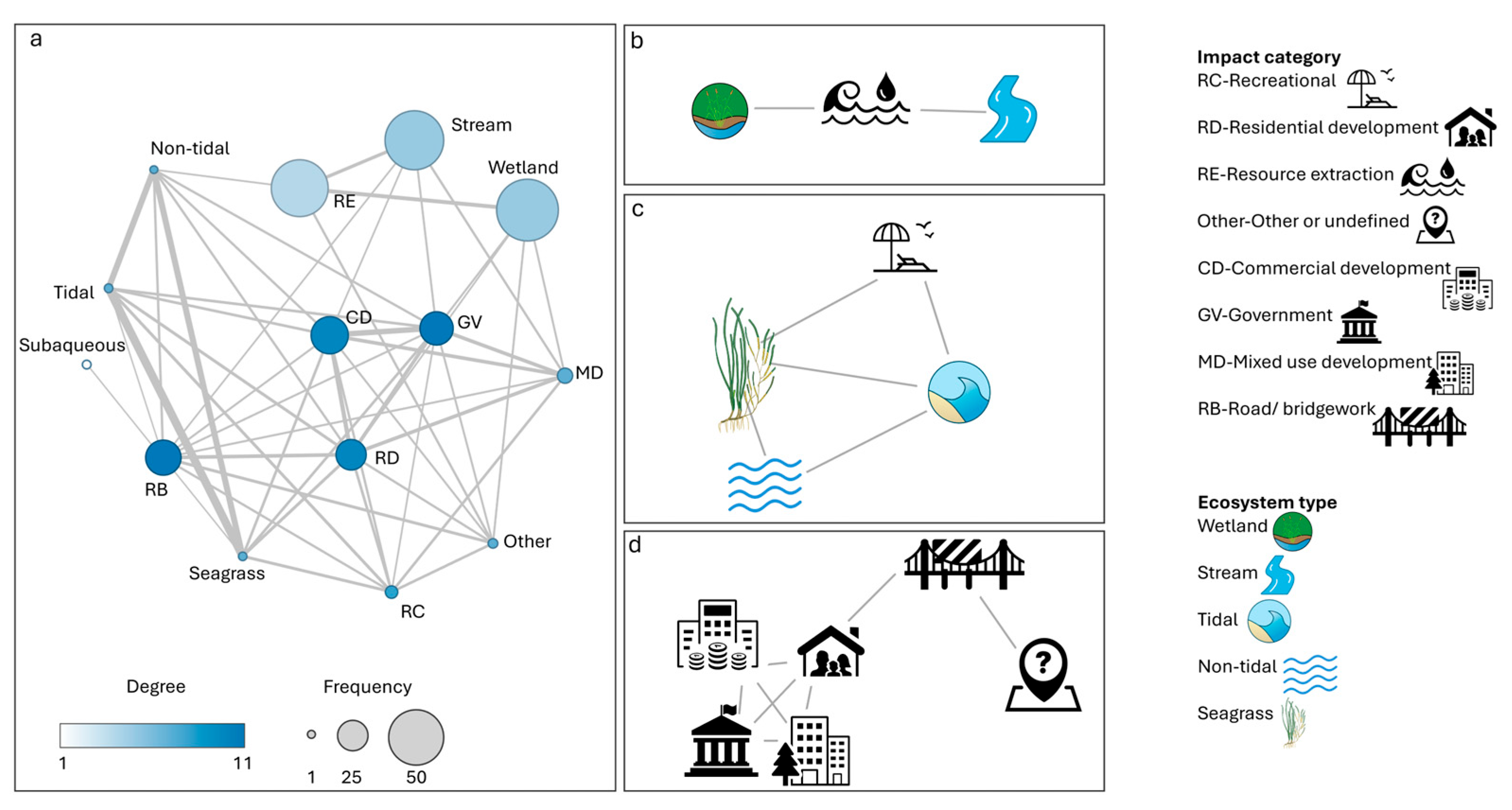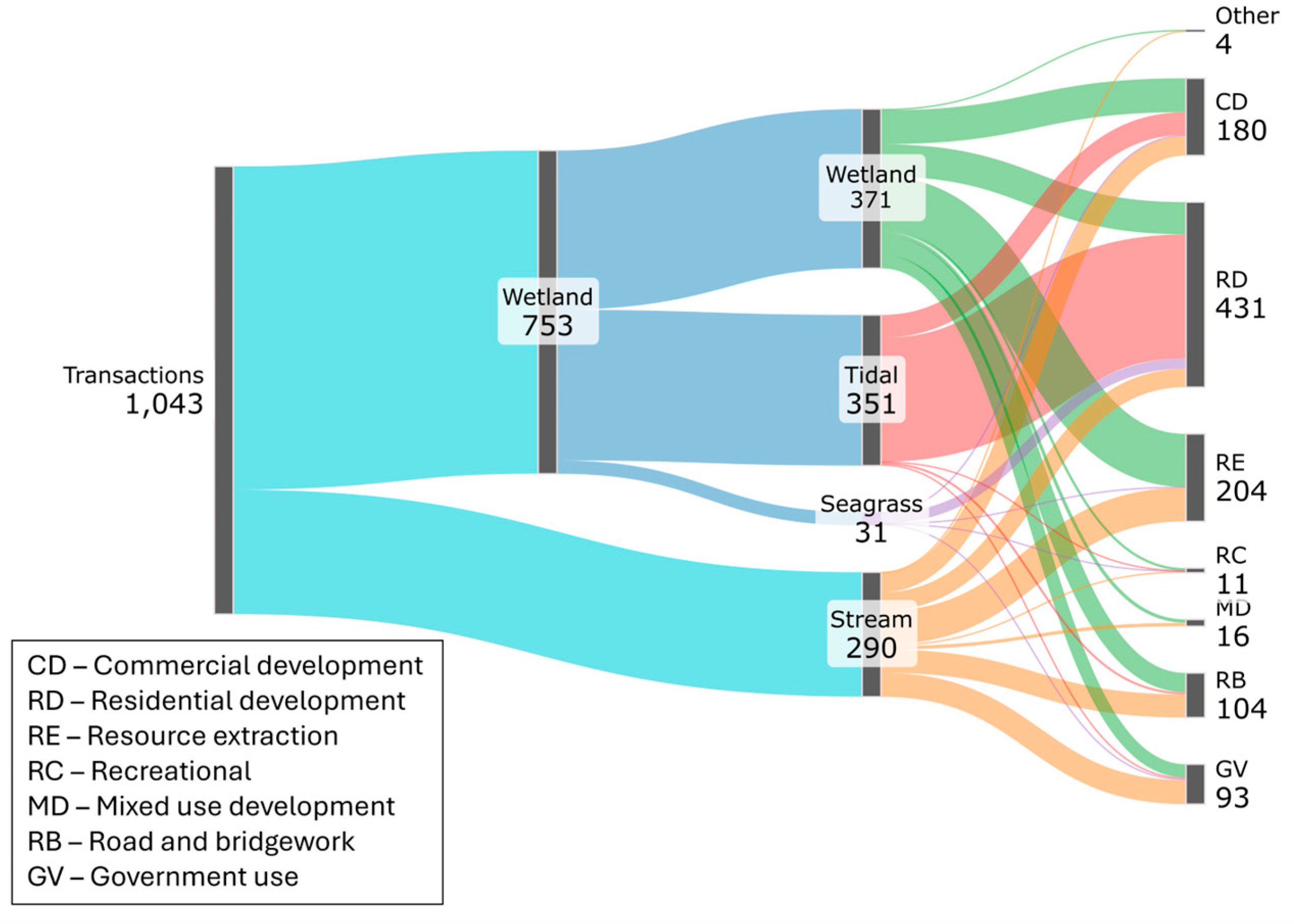 | Impact categories/ types | Classifies impacts by the nature of the activity. Road and Bridgework (RB) Residential Development (RD) Commercial Development (CD) Resource Extraction (RE) Recreational (RC) Mixed-use development (MD) Other or undefined (Other) Government use (GV) |