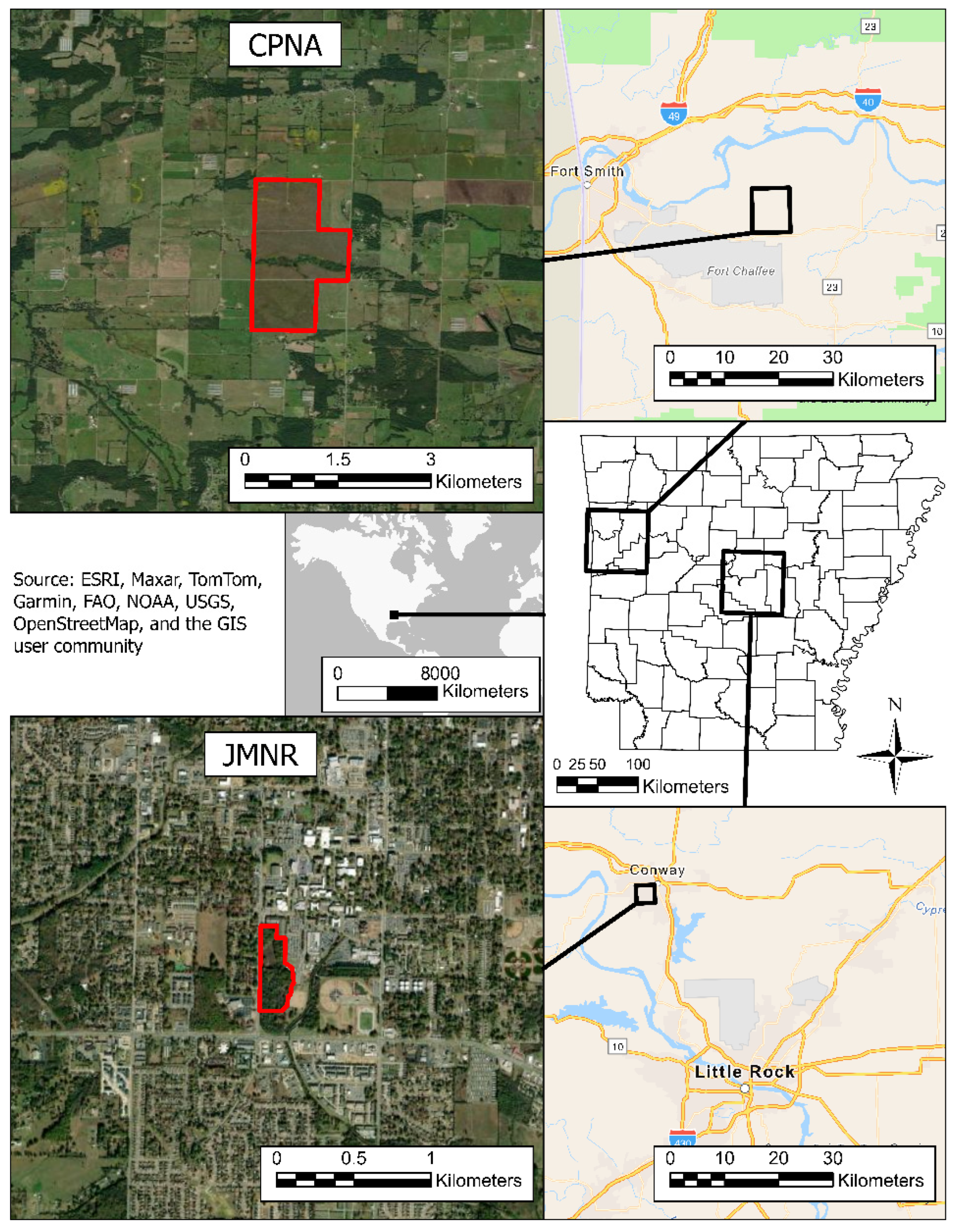 - Baker, B.T. The Vascular Flora of Scott County and Yell County, Arkansas. Master’s Thesis, University of Central Arkansas, Conway, AR, USA, 2007. [Google Scholar]