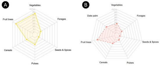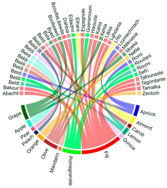 Agriculture in Morocco’s pre-Saharan oases is generally traditional and subsistence oriented [7]. The surveyed oases follow this pattern, characterized by polyculture, with 43 cultivated species identified. These include 15 fruit trees, 13 vegetables, six cereals, five legumes, two spices, and two forage crops (Table S5). This profile is comparable to what has been reported in other oases, both in the region [7,9] and more broadly across North Africa [28,29,30,31,32]. Fruit trees form the arboreal stratum beneath the date palm canopy, playing a central role in maintaining the balance of oasis agroecosystems. They represent the most diverse group, accounting for 34.5% (39 varieties) of total varietal richness, excluding date palm diversity (Figure 2, Table S4). Figure (Ficus carica L.) shows the greatest diversity with 11 varieties, followed by pomegranate (Punica granatum L.) and grapevine (Vitis vinifera L.) (Figure 3, Table S4).