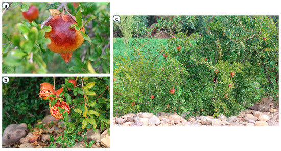 The Guersmoum variety of acidic pomegranate, photographed in the Tagmoute palm grove, with a close-up of pomegranate fruit (a), fruit split at maturity (b), and pomegranate shrub (c).