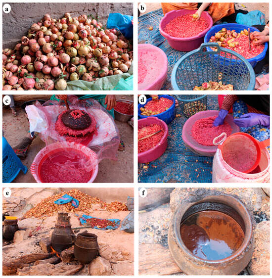 The production process of Amaghousse: (a) pomegranate storage before processing; (b) fruit peeling; (c) juice extraction; (d) juice filtration; (e) traditional cooking; (f) final molasses product.