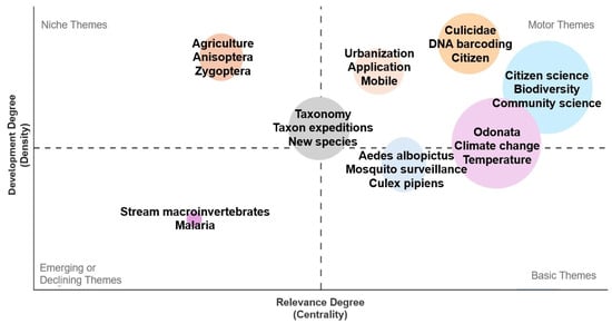 The quadrant of driving themes includes citizen science, community science, biodiversity, DNA barcoding, and Culicidae (Figure 5), demonstrating that these terms form the conceptual and methodological core of the literature on citizen science in freshwater biomonitoring using aquatic insects.