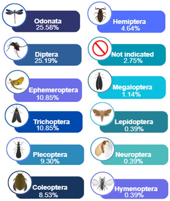 The orders most represented in citizen science studies involving aquatic insects were Odonata (n = 66; 25.58%) and Diptera (n = 65; 25.19%), followed by Ephemeroptera (n = 28; 10.85%), Trichoptera (n = 28; 10.85%) and Plecoptera (n = 24; 9.30%). Other orders, such as Coleoptera (n = 22; 8.53%), Hemiptera (n = 12; 4.64%), Megaloptera (n = 3; 1.14%), and Lepidoptera, Neuroptera, and Hymenoptera, each with one record (0.39%), were less represented. In addition, seven records (about 2.75%) did not specify the orders used (Figure 6).