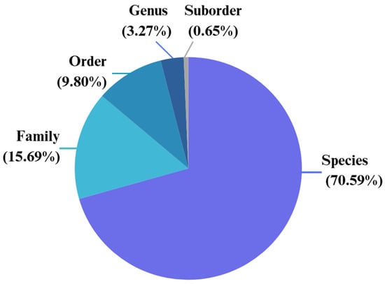 The results show a marked predominance of studies using taxonomic levels of species (n = 108; 70.59%), followed by family (n = 24; 15.69%), order (n = 15; 9.80%), genus (n = 5; 3.27%), and suborder (n = 1; 0.65%) (Figure 7).