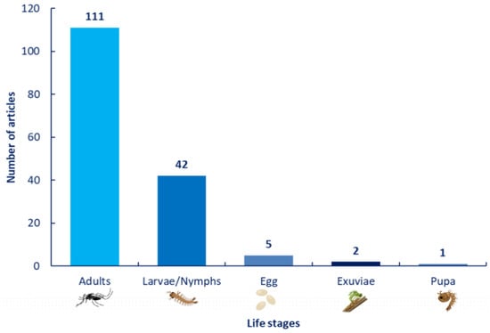 The majority of the studies analyzed focused on organisms in the adult stage (n = 111; 69%), followed by the larval and nymphal stages (n = 42; 26.03%). In contrast, the egg (n = 5; 3.11%) and pupal stages (n = 1; 1.24%) were considerably less investigated. Exuviae (n = 2; 0.62%) do not represent a stage of the life cycle but were included as they are related to the type of material examined, in line with the objective of characterizing the biological focus of the studies (Figure 8).
