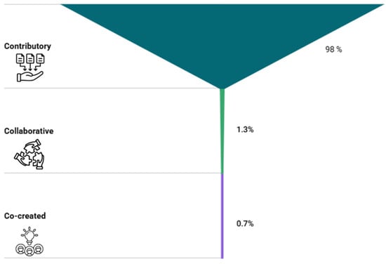 Participation in this type of initiative was, practically unanimously, at the contributory level, which predominates (n = 150; 98%), while collaborative (n = 2; 1.3%) and co-created levels (n = 1; 0.7%) remain incipient (Figure 10).