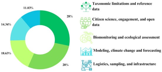The main practical and methodological challenges described in the studies were grouped into categories of analysis that emerged from reading the articles, resulting in five categories: (a) Taxonomic limitations and reference data: Includes articles that indicate Linnean and Wallacean deficits, lack of specialists, limitations for identification at the order, family, and genus levels, and absence of scientific collections to support the findings. (b) Logistics, sampling, and infrastructure: Covers documents that report disparities in sample sizes, spatial and temporal biases in the data collected, under sampling in tropical regions, logistical challenges, costs, and difficult access to remote areas. (c) Biomonitoring and ecological assessment: Articles describing limitations in the use of metrics for ecological assessment, monitoring, and restoration of aquatic ecosystems, as well as the limited use of some insect orders. (d) Modeling, climate change, and prediction: Articles that point to the scarcity of research focused on risk prediction through modeling, as well as the lack of studies addressing the impacts of climate change on water resources. (e) Citizen science, engagement, and open data: Articles that mention the lack of public participation, use of applications, and data from crowdsourcing (collaborative form). They also highlight the lack of initiatives for education and validation of information generated by citizen science projects. Figure 2 visually presents all the categories adopted in the analysis.